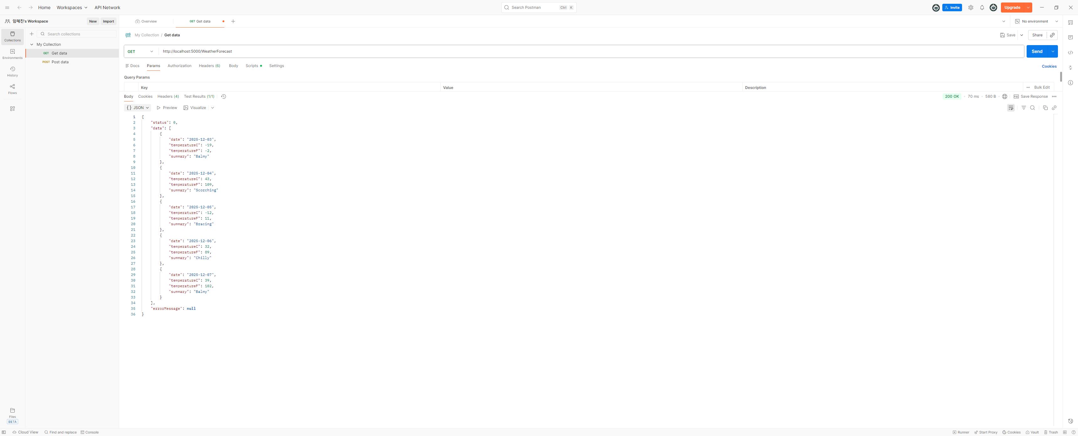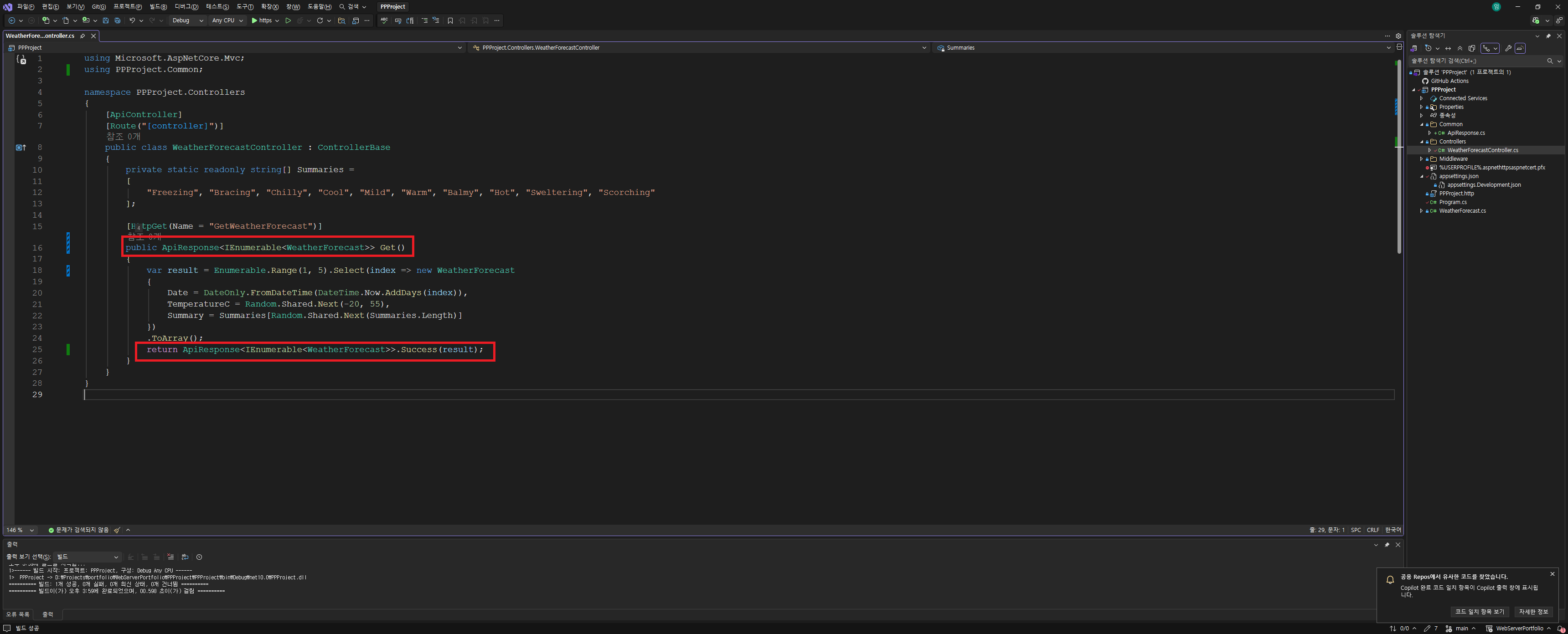 이제 기존에 기본 템플릿으로 생성된 WeatherForecast Api에서 테스트 해보도록 하겠습니다.