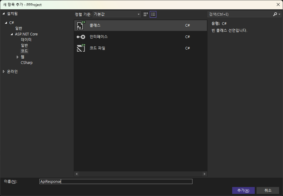 추가 -> 클래스로 'ApiResponse.cs'클래스를 생성해줍니다.