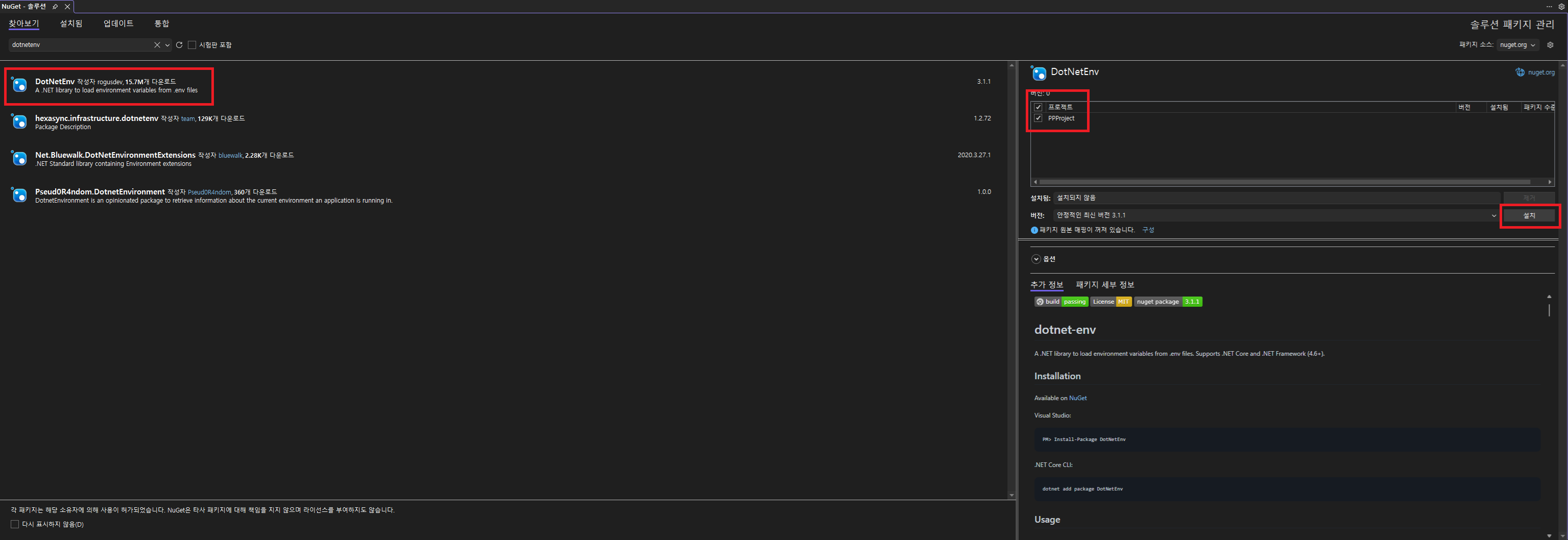 위와 같이 NuGet패키지에서 DotNetEnv를 검색하여 설치해줍니다.