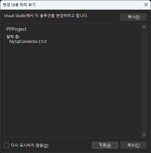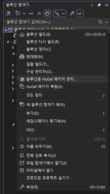Visual Studio에서 솔루션용 NuGet패키지 관리를 클릭합니다.