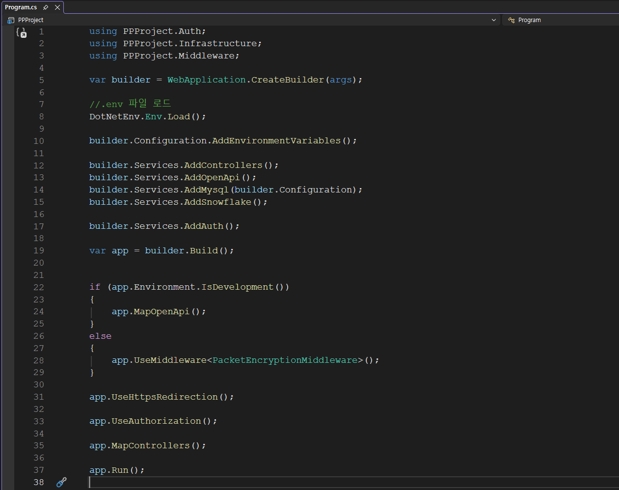 Program.cs 에 Development가 아닐 경우 MiddleWare를 실행시키는 코드를 추가합니다.