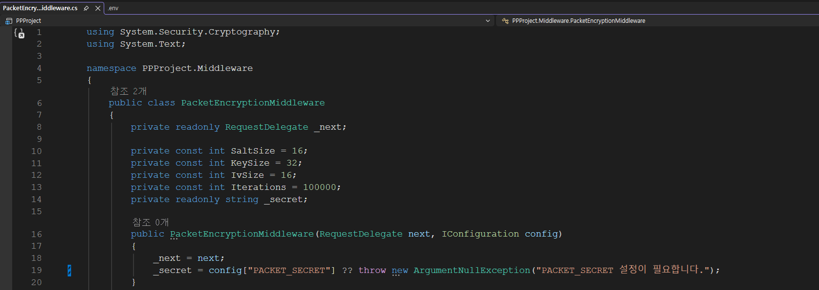 PacketEncryptionMiddleware 클래스에서 RequestDelegate 와 _secret값을 주입받아 초기화 합니다.