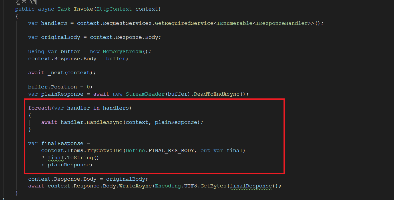 분리한 Response 암호화 기능에 IResponseHandler를 상속하여 파이프라인에 참여하도록 하며,